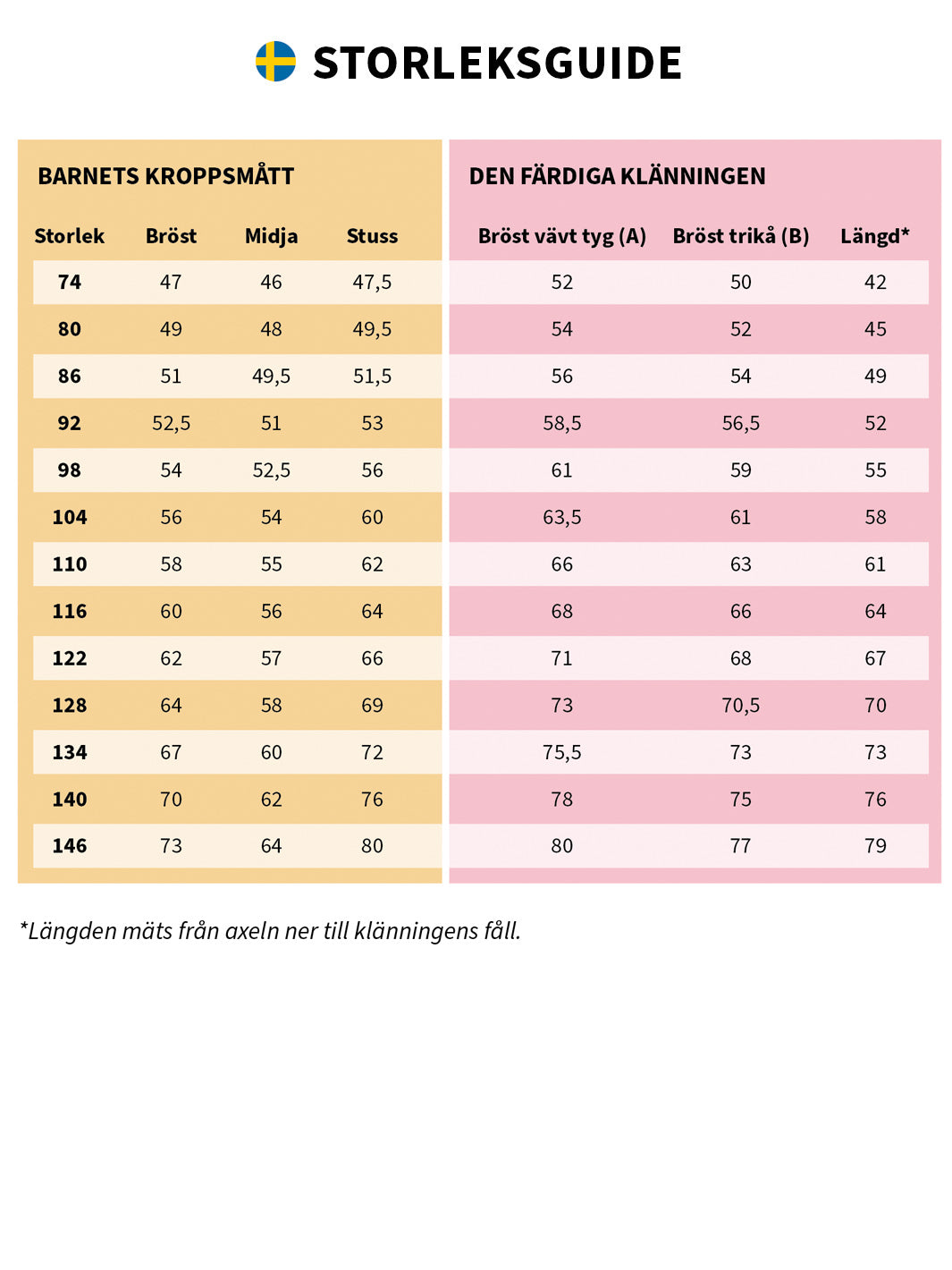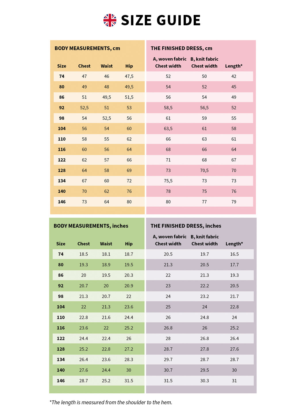 Choose size on the child’s current measurements; mostly height, chest and waist width (hip width is not relevant). If the child is between two sizes, choose the larger one. The Juni dress has 5-8 cm (2-3”) ease in chest width if you’re sewing variant A (woven fabric). If you choose variant B (knit fabric) there’s a bit less ease: 3-4 cm (1.2-1.6”).
