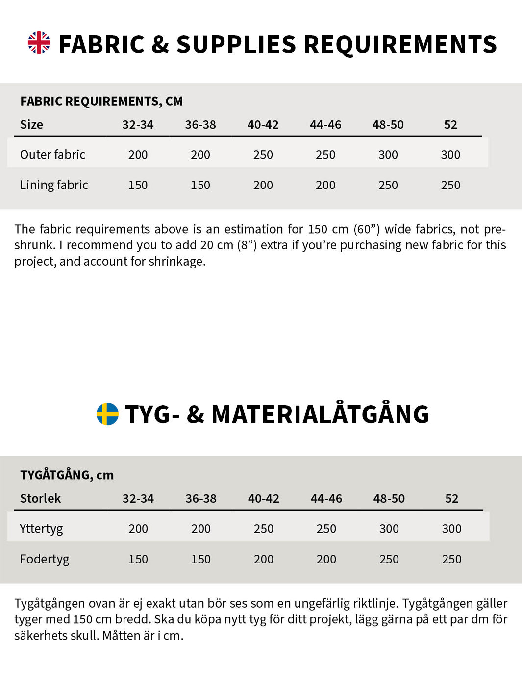 Se tyg- och materialåtgångstabellen bland bilderna.