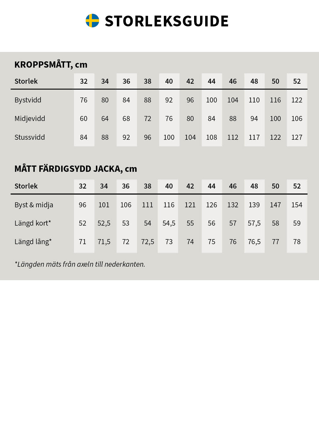 Se storlekstabellen bland bilderna.